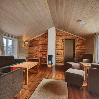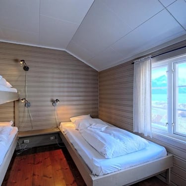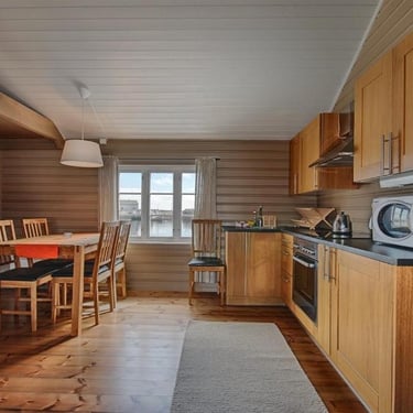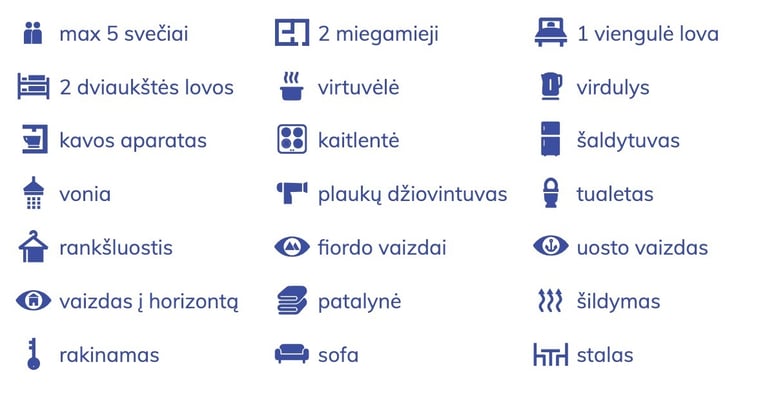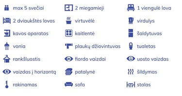 Gyvensime po 2 asmenis kambaryje. Nameliuose yra svetainė su poilsio zona ir vonios kambarys su dušu. Virtuvėje - šaldytuvas, viryklė ir valgomojo zona. Iš namelių atsiveria Hamnøy uosto, Vest fjordo, Reine fjordo, kalnų, žvejų kaimelio ar kitų namelių vaizdai.